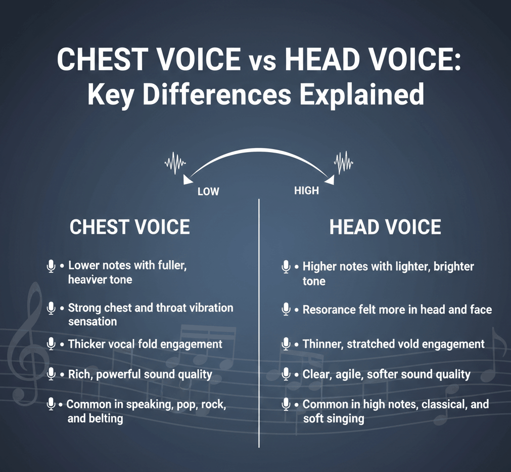 Chest voice is the lower register with a fuller, stronger tone that feels resonant in the chest, while head voice is a higher, lighter register with more flexibility and resonance in the head. Both are essential for vocal range and control.