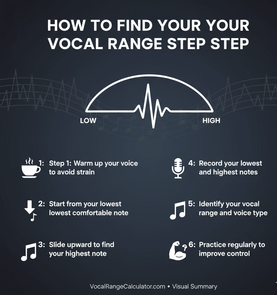 To find your vocal range, start at a comfortable note and sing up and down a piano or pitch tool until you reach your highest and lowest notes without strain. Your vocal range is the span between those two notes. Use online tests for estimates, or a coach for accuracy.