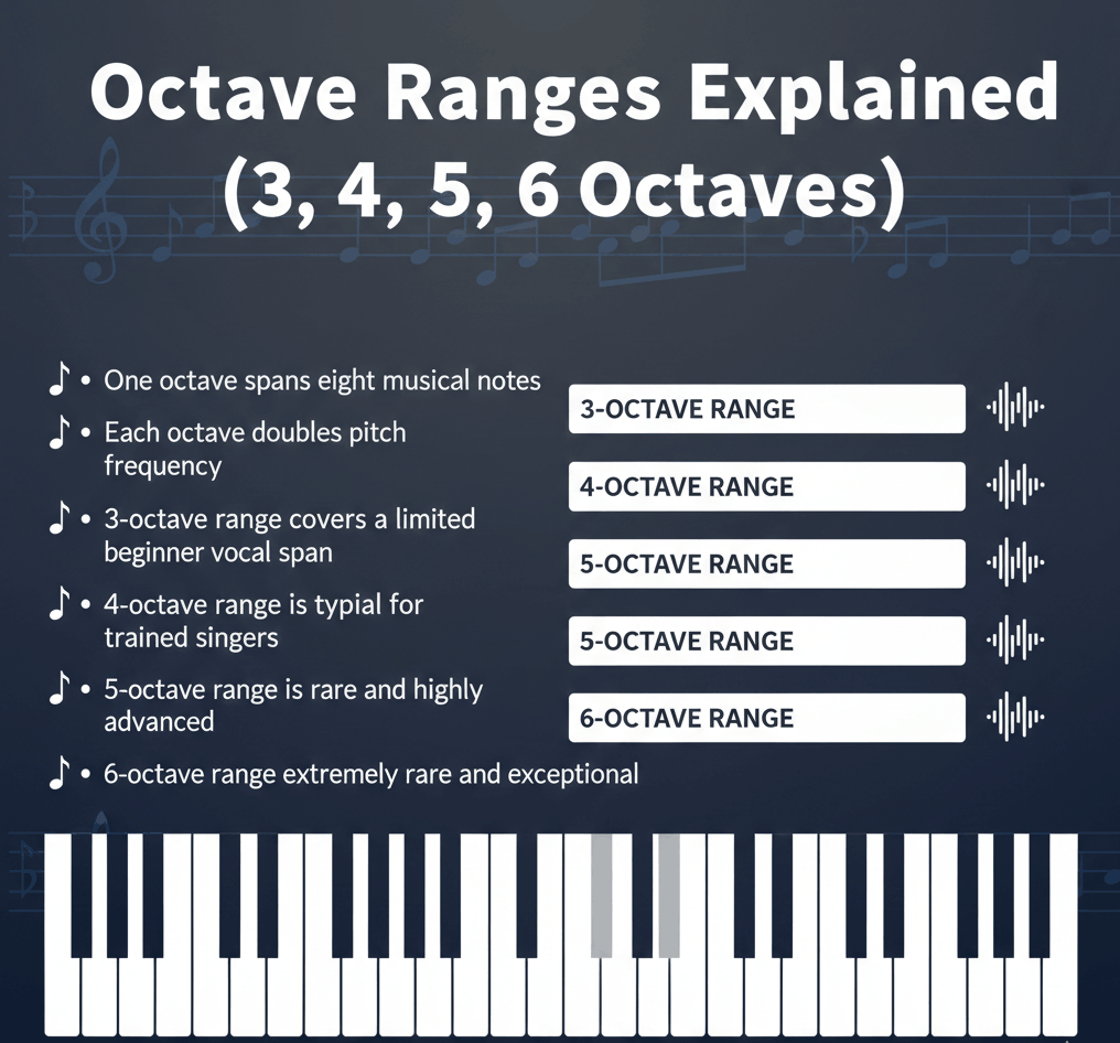 An octave range describes how many times your voice can double in pitch from its lowest to highest usable note. Most people have a 2–3 octave usable range. Ranges above 4 octaves are rare and often misunderstood.