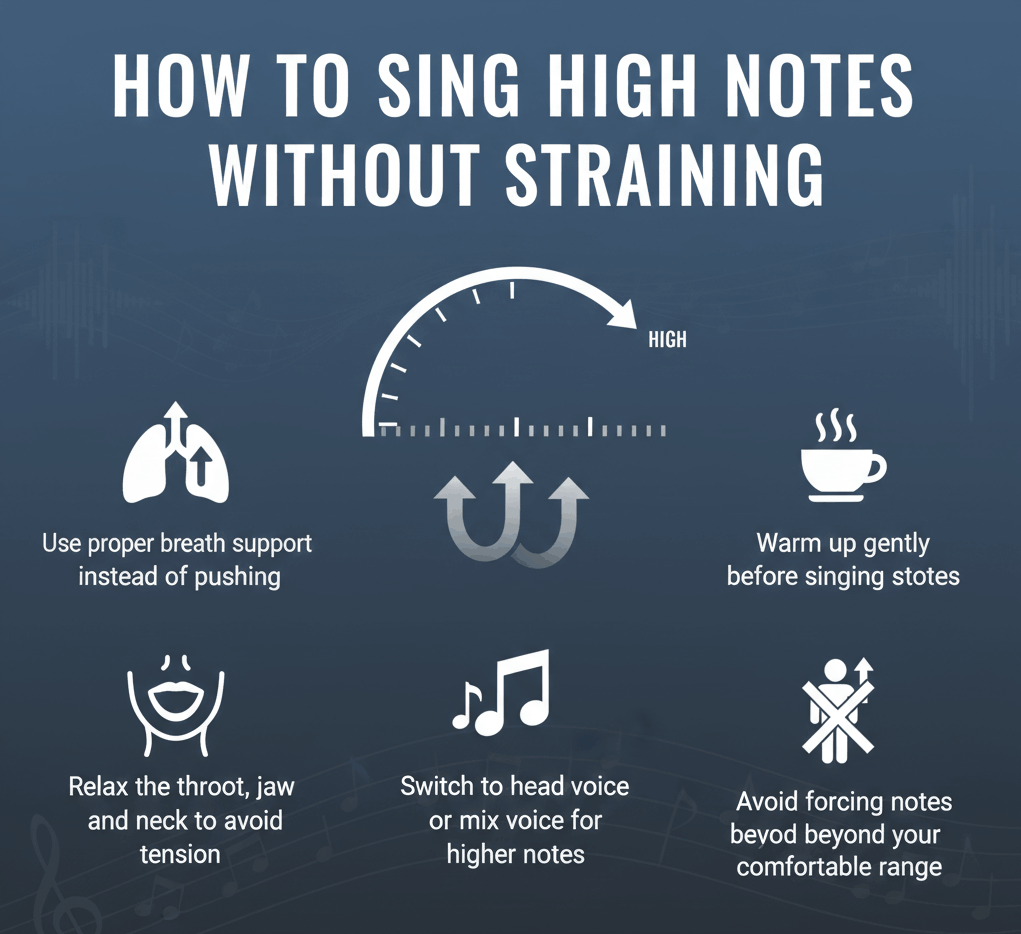 To sing high notes without straining, use proper breath support, relax your throat and jaw, avoid pushing volume, and shift into head voice or mixed voice. Warm up with scales, lip trills, and light resonance to keep high notes controlled and tension-free.