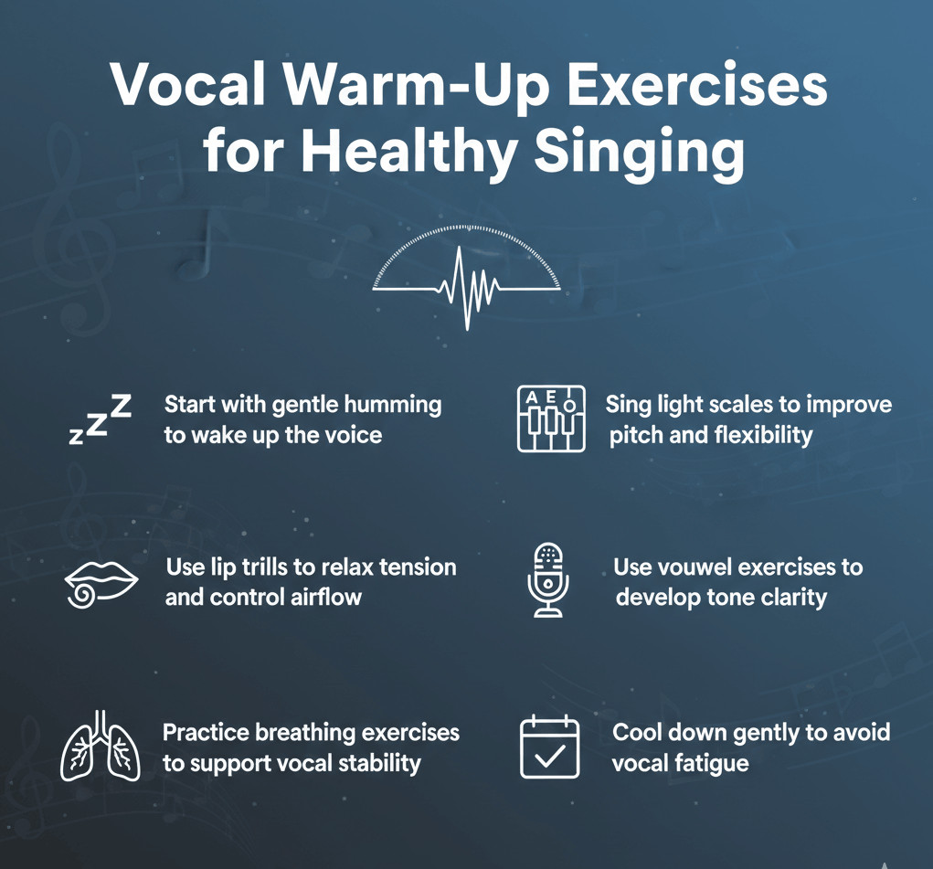 Vocal warm-up exercises include lip trills, humming, sirens, scale runs, and breath control drills. These improve vocal flexibility, increase range, enhance tone, and reduce strain. Warm up 10–15 minutes daily to protect your voice and sing with better control.