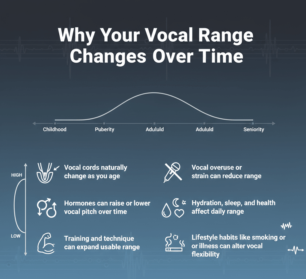 Vocal range changes due to age, vocal training, hormone shifts, vocal health, and technique improvements. Regular practice can expand range, while strain, illness, or lack of use may reduce it. Proper care helps maintain and grow your range safely.